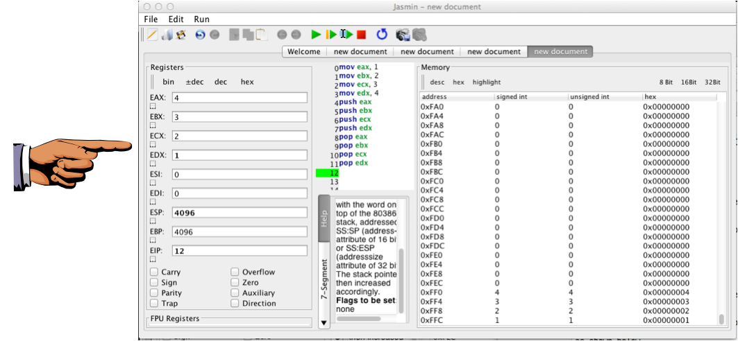 Before running the program, notice the ESP: it contains 4096, as shown below.在运行程序之前,请注意ESP:它包含4096,如下所示。mov eax, 4 mov eax,4 mov ebx, 6 mov ebx,6 push eax推eax push ebx推ebx