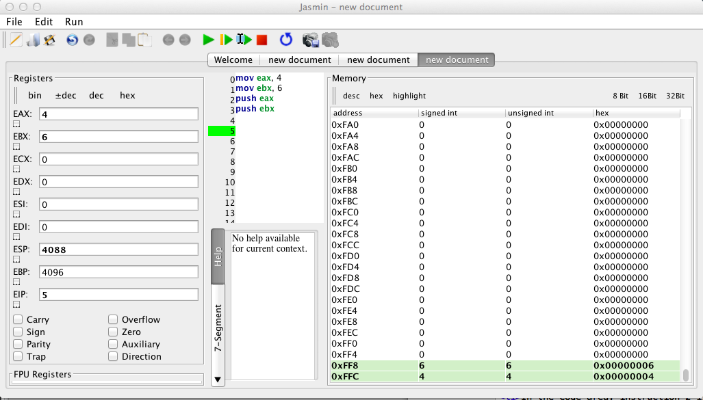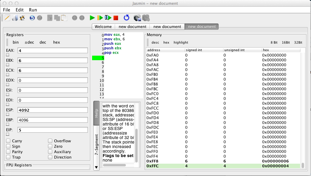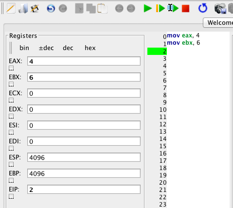 Run the code.运行代码。mov eax, 4 mov eax,4 mov ebx, 6 mov ebx,6 push eax推eax push ebx推ebx pop ecx pop ecx