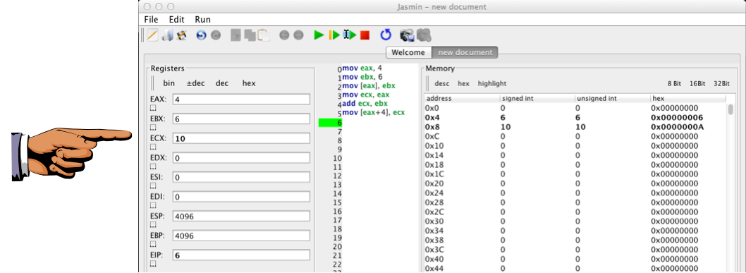 Add the value in ebx (which is 6) to the value in ecx (which is 4), and put the result into ecx (the result is 10)将ebx中的值(它是6)添加到ecx(它是4)中的值,并将结果放入ecx(结果为10) mov [eax+4], ecx