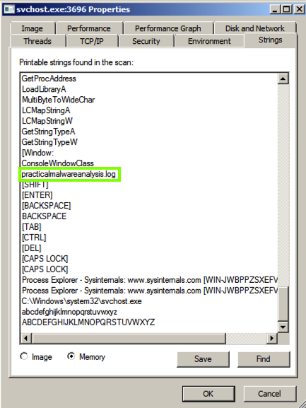 At the bottom of the box, click the Memory button. Now the strings are completely different, and contain these suspicious items: GetActiveWindow and SetWindowsHookExA.