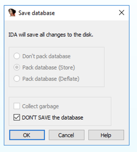 In the "Save database" box, click "DON'T SAVE the database", as shown below. Click OK.