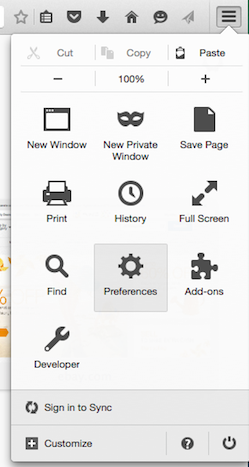 In Firefox, at the top right, click the icon with three lines on it. Click Preferences, as shown below.