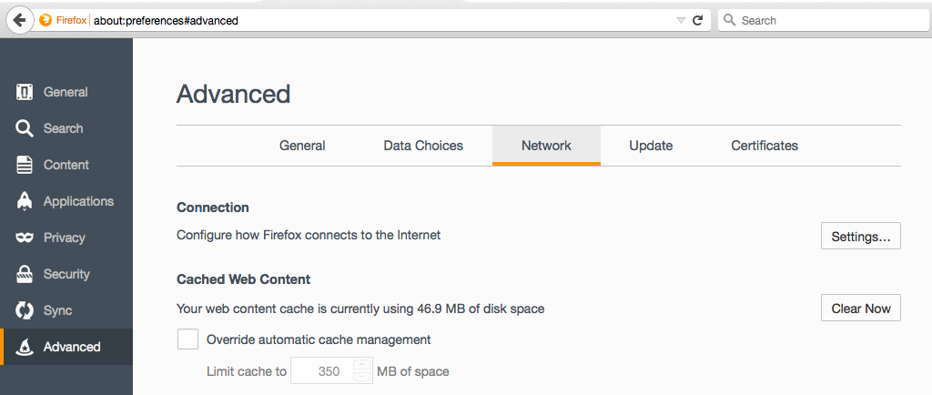 On the left side, click Advanced. In the top center, click Network. In the "Connection" section, click the Settings... button, as shown below.