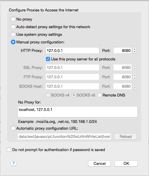 In the "Configure Proxies to Access the Internet" box, check the "Manual proxy configuration" box, and enter an HTTP Proxy address of 127.0.0.1 on port 8080, as shown below.