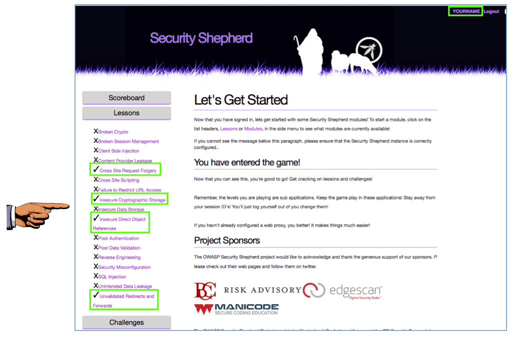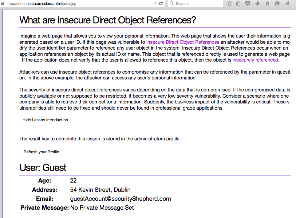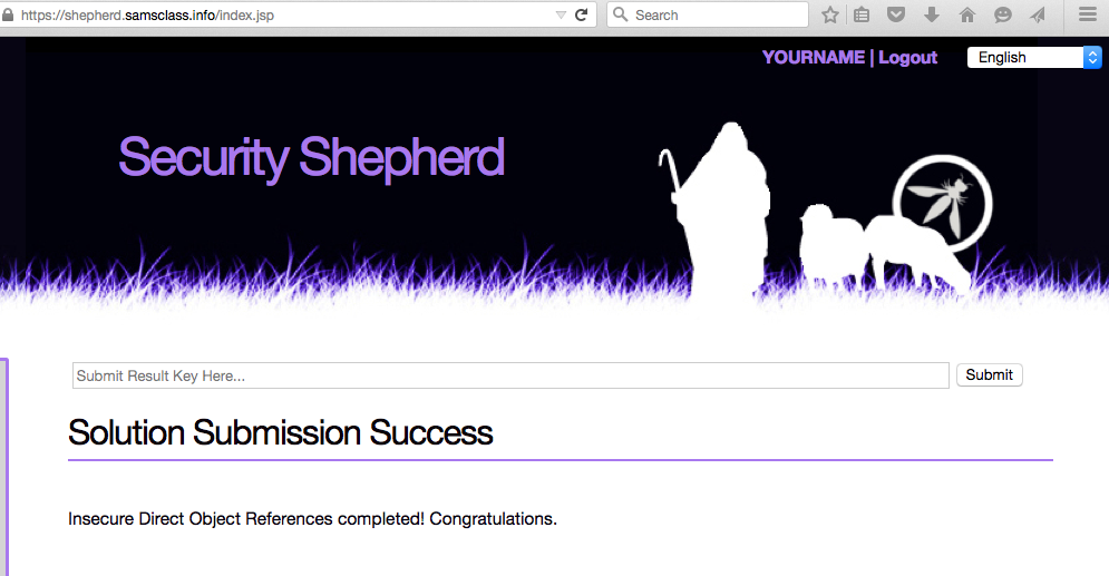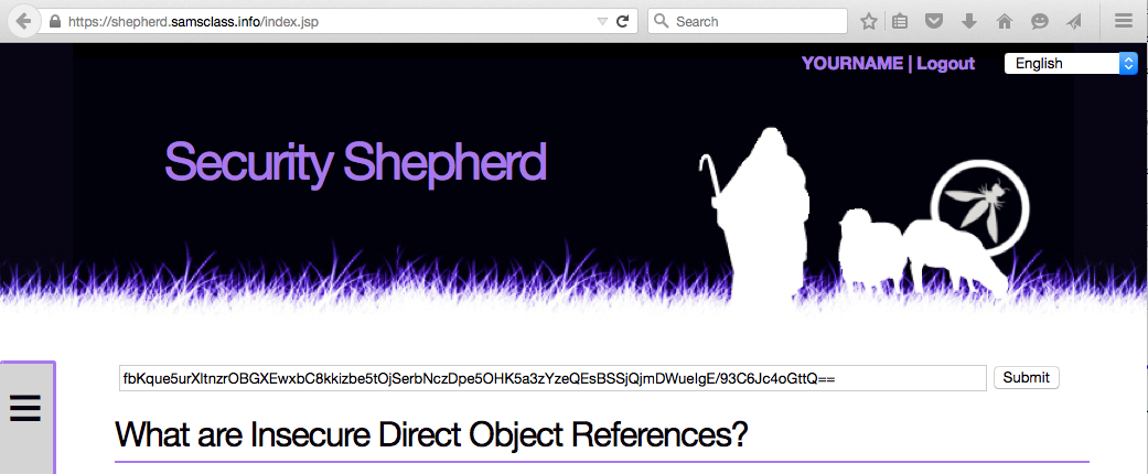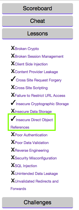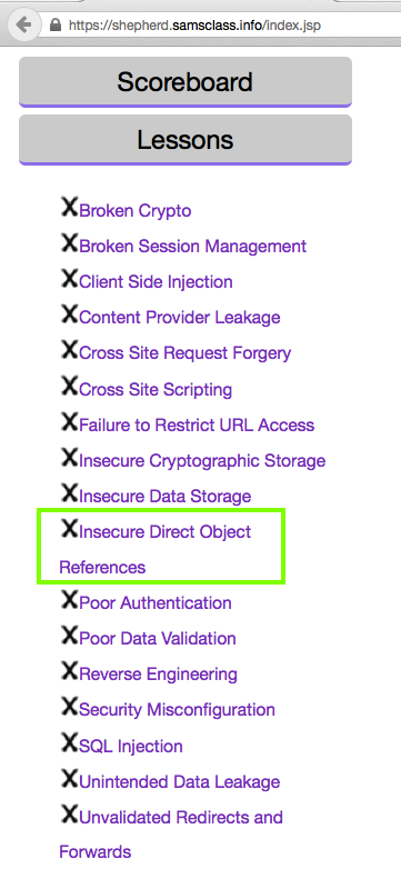 On the left side of the Security Shepherd page, you should see a checkmark next to "Insecure Direct Object References", as shown below.
