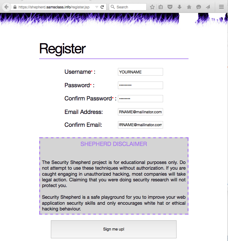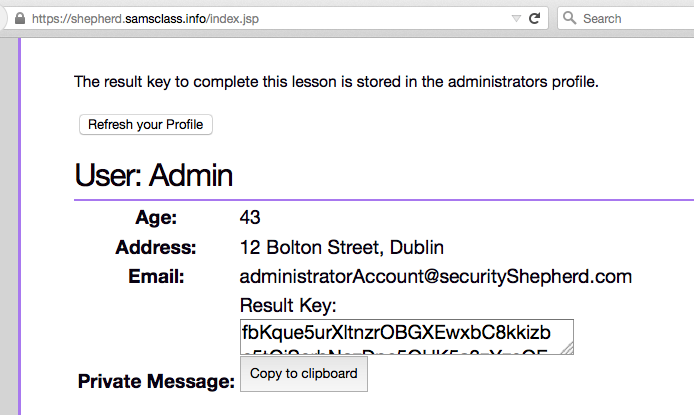 Copy the key and paste it into the field at the top of the Security Shepherd page, as shown below.
