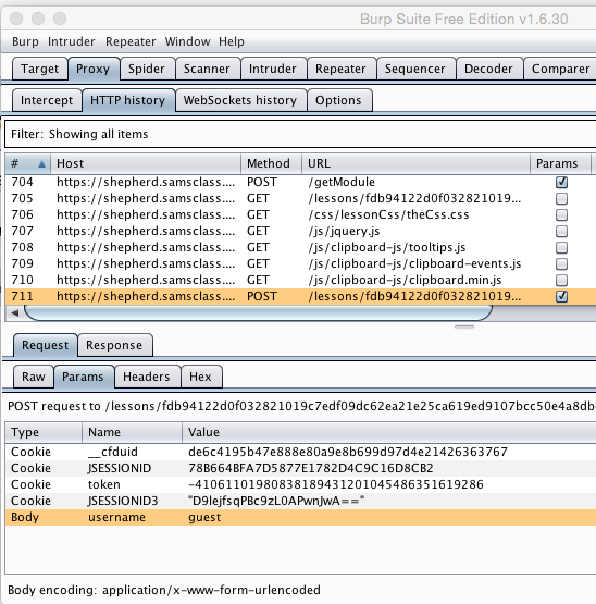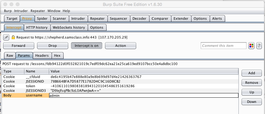 In Burp, on the Proxy tab, on the "HTTP history" sub-tab, find the last request in the list, and click it. It's a POST to https://shepherd.samsclass.info.