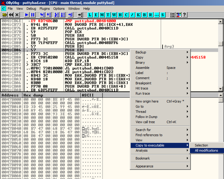 In Ollydbg, from the menu bar, click File, Open. Navigate to puttybad.exe and open it.
