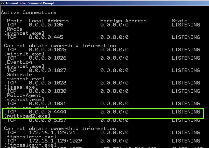 You should see puttybad.exe LISTENING on port 4444,
