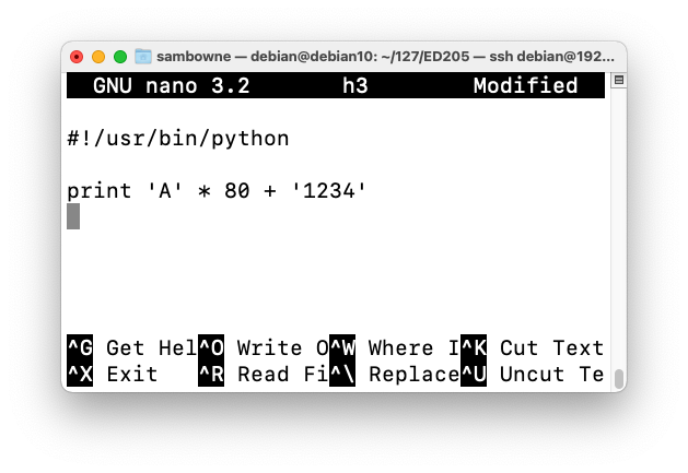 As shown below, the program crashes with $eip = 0x34333231, or the ASCII text '1234'.gdb -q ./ED205 run $(./h3) info registers