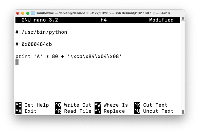 As shown below, the program crashes with $eip = 0x36363535, or the ASCII text '5566'.gdb -q ./ED205 run $(./h2) info registers q y
