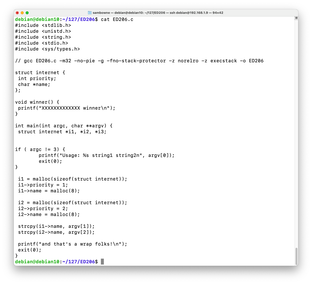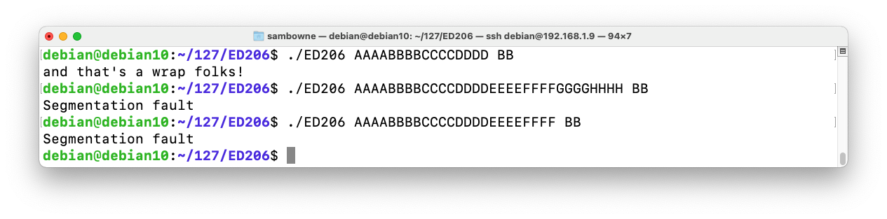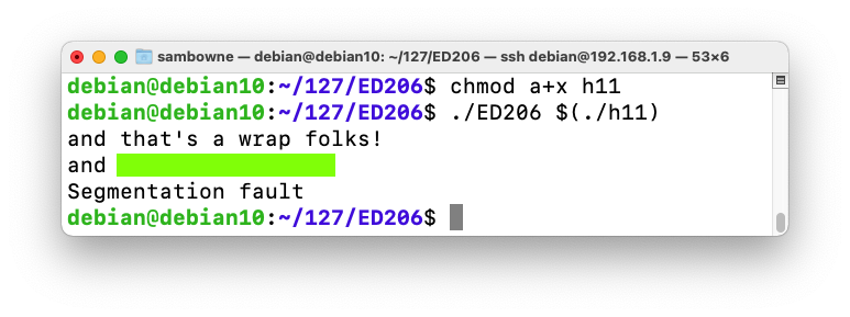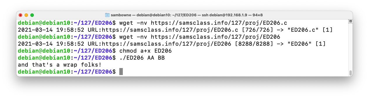 The program downloads and runs, printing "and that's a wrap folks!", as shown below.wget -nv https://samsclass.info/127/proj/ED206.c wget -nv https://samsclass.info/127/proj/ED206 chmod a+x ED206 ./ED206 AA BB