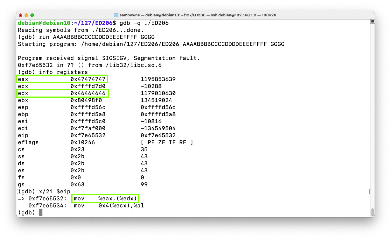 As shown below, the program crashes with:gdb -q ./ED206 run AAAABBBBCCCCDDDDEEEEFFFF GGGG info registers x/2i $eip