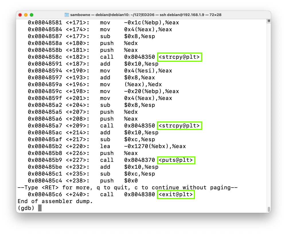Press Enter several times to move to the end of the code, as shown below (your addresses may be different). There are two calls to strcpy, then one to puts, and one to exit.disassemble main