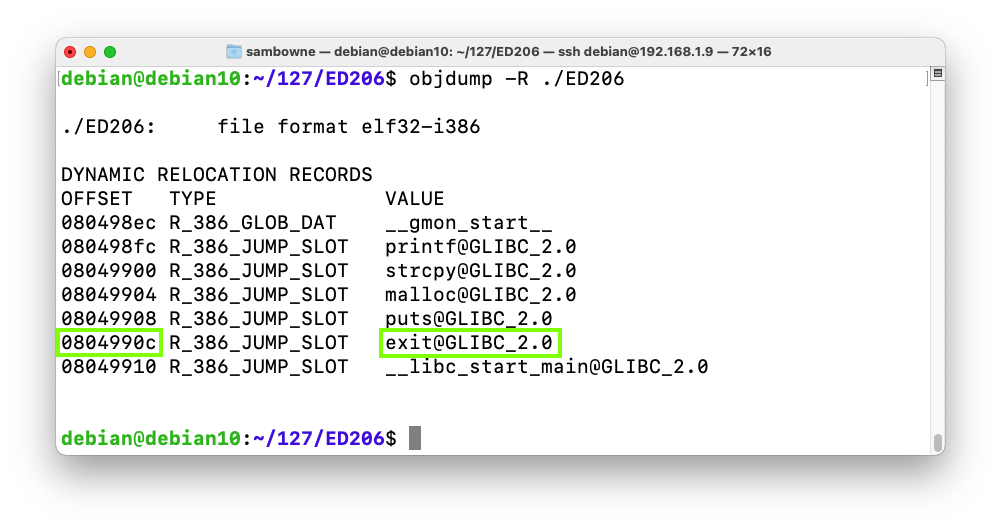 As shown below, when I did it, the address of "exit" was stored at 0804990c.objdump -R ./ED206