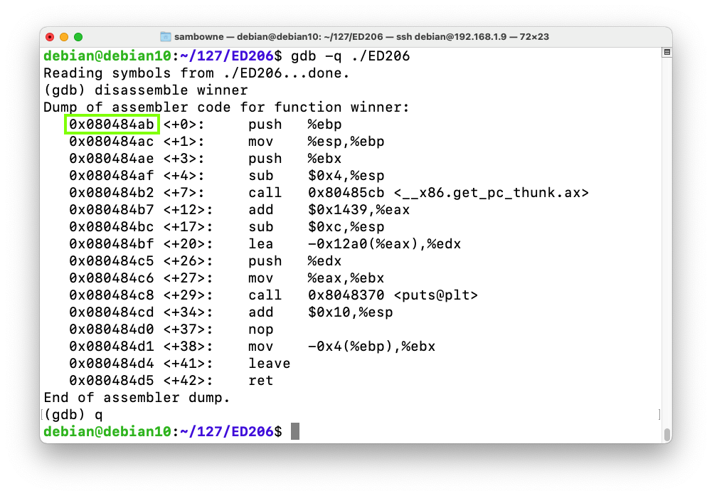 As shown below, when I did it, this function started at address 0x080484ab.gdb -q ./ED206 disassemble winner q