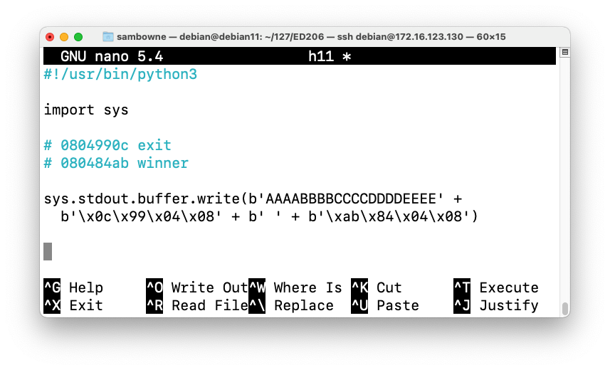 In nano, enter this code, to overwrite the return pointer with the start of winner().nano h11
