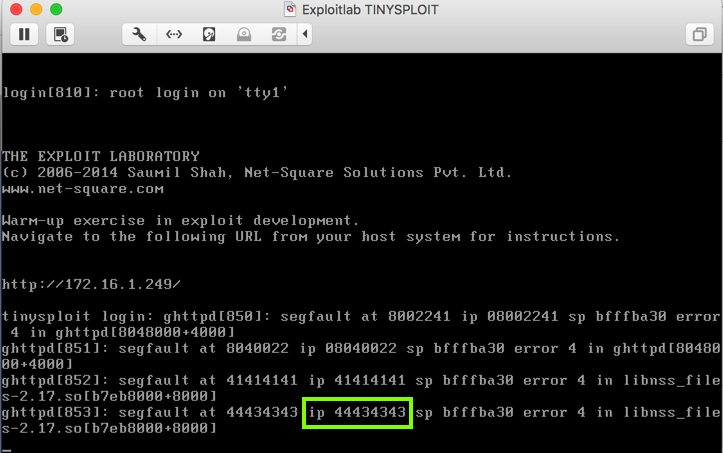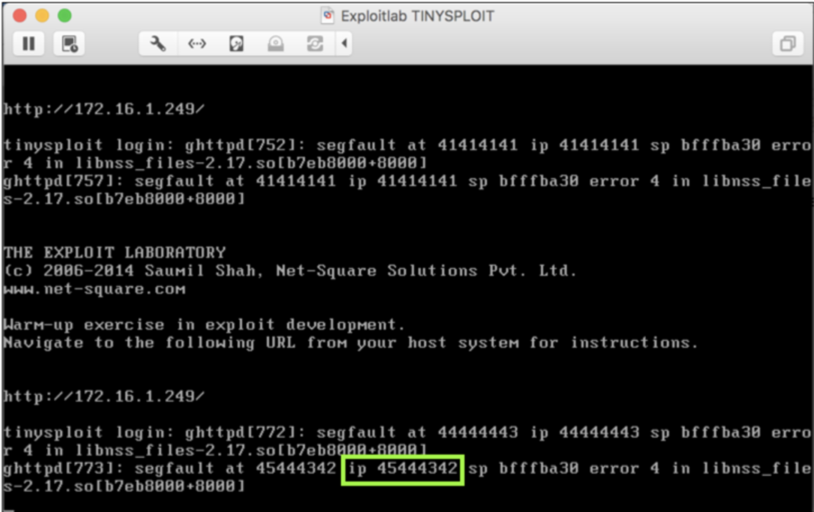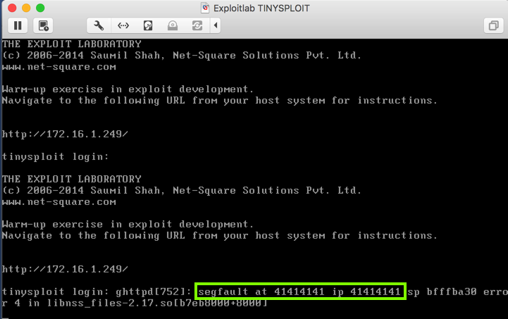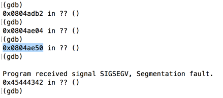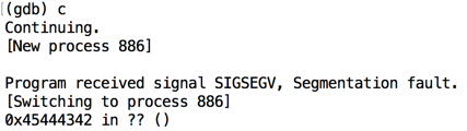 It shows a "segfault" error, with "ip 41414141", as shown below.