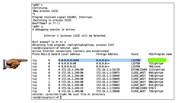 The target halts, with the message