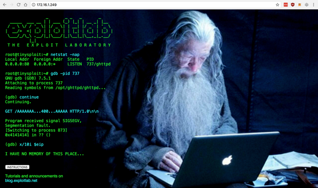 A pretty Web page appears, with very terse hints for the exploitation, as shown below.