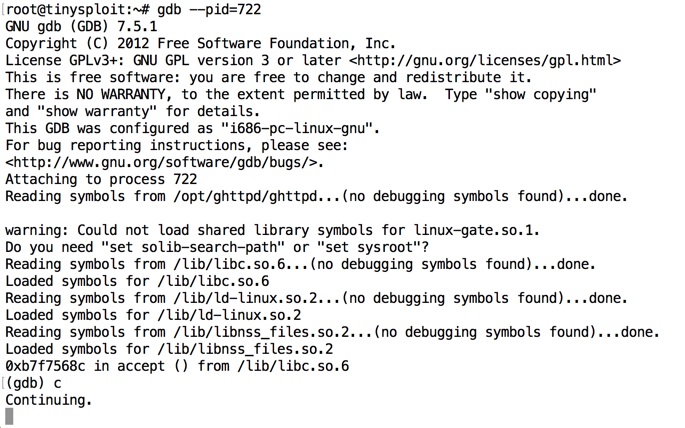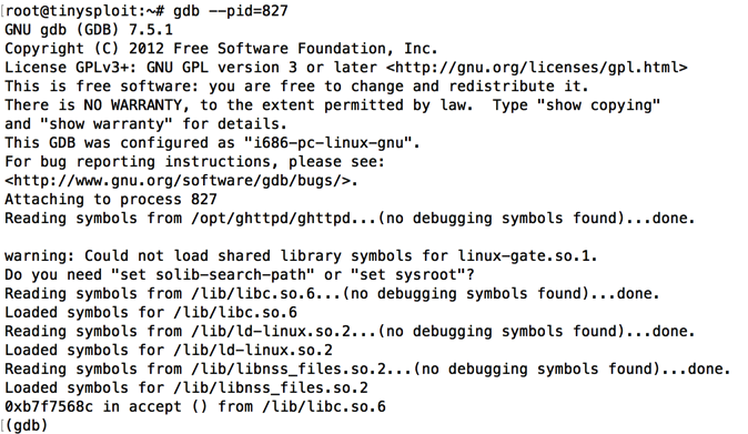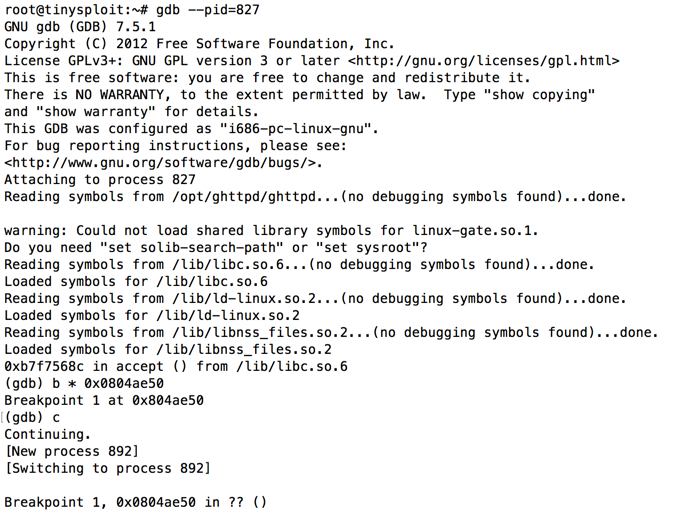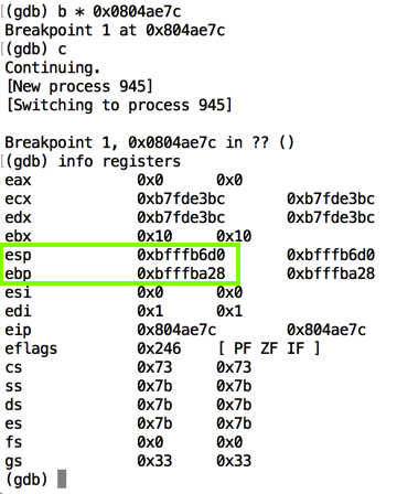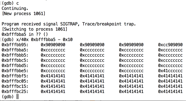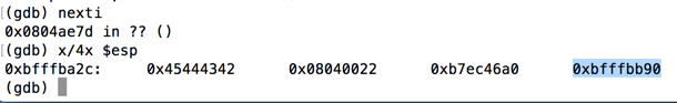 Note the address it halts at. When I did it, the address was 0xbfffbba5, as shown below.