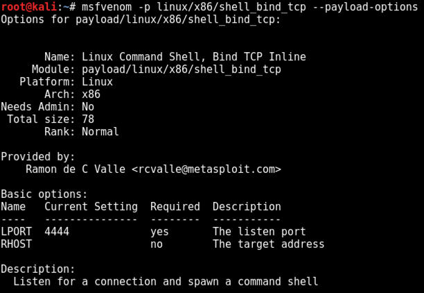 msfvenom -p linux/x86/shell_bind_tcp --payload-options