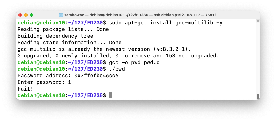The program runs normally, wth the "Fail!" message, as shown below.sudo apt-get update sudo apt-get install gcc-multilib -y gcc -o pwd pwd.c ./pwd 1