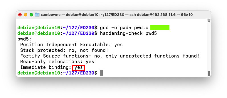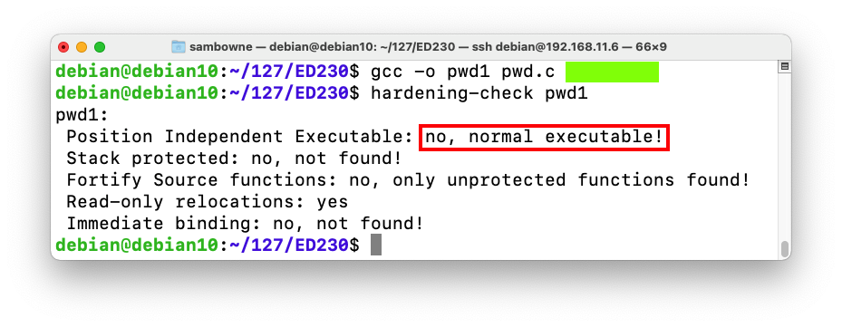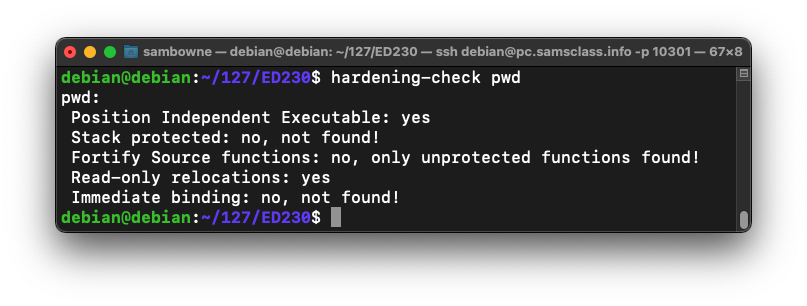 You see a list of defenses, and whether they are implemented, as shown below.sudo apt-get install devscripts -y hardening-check pwd