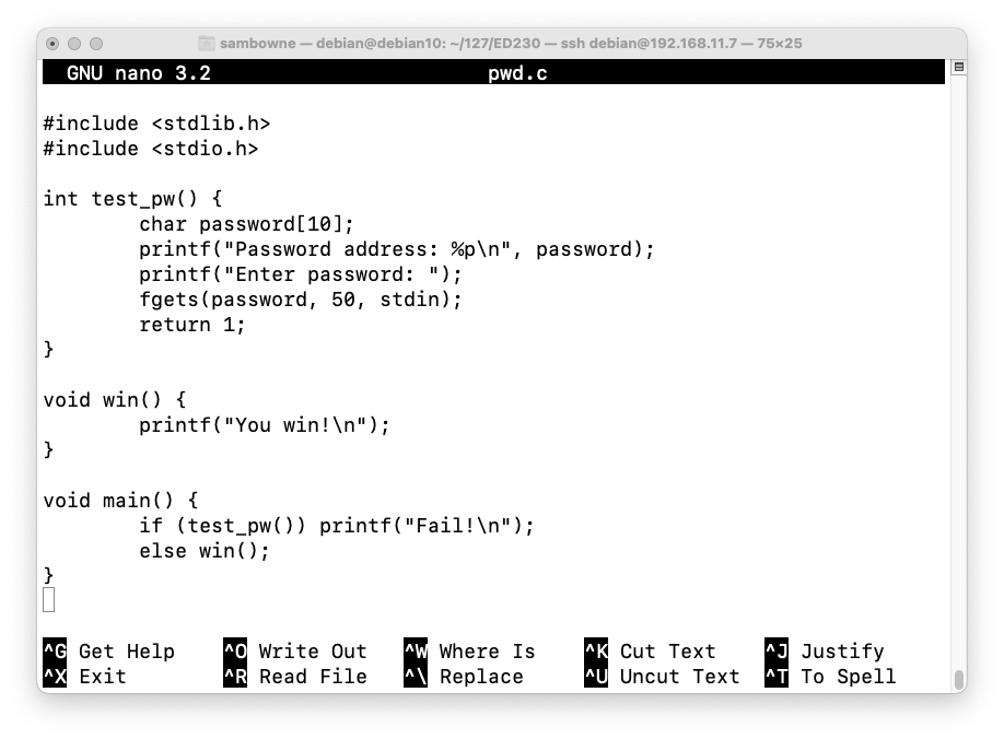 The test_pw function reserves room for 10 characters in pin[], but reads up to 50 characters from stdin, allowing a buffer overflow.#include <stdlib.h> #include <stdio.h> int test_pw() { char password[10]; printf("Password address: %p\n", password); printf("Enter password: "); fgets(password, 50, stdin); return 1; } void win() { printf("You win!\n"); } void main() { if (test_pw()) printf("Fail!\n"); else win(); }