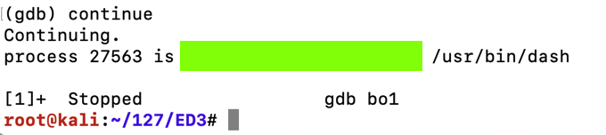 The exploit works, executing a new program "/bin/dash", as shown below.continue