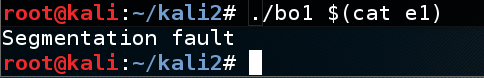 The program crashes with a "Segmentation fault" message, as shown below../bo1 $(cat e1)