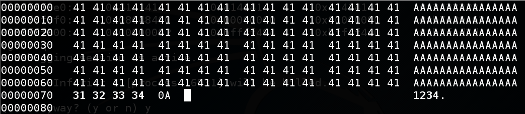 In the hexedit window, carefully change the last 4 '41' bytes from "41 41 41 41" to "31 32 33 34", as shown below.