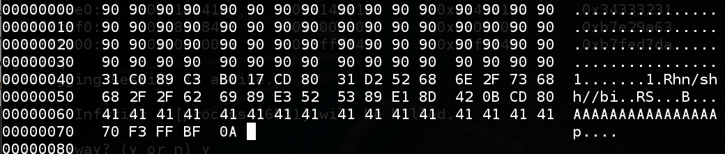 The exploit should look exactly like the image below.chmod a+x b3 ./b3 > e3 hexedit e3