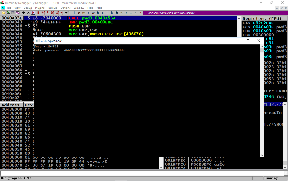 Immunity pauses again immediately. Click Debug, Run again.