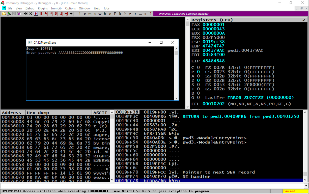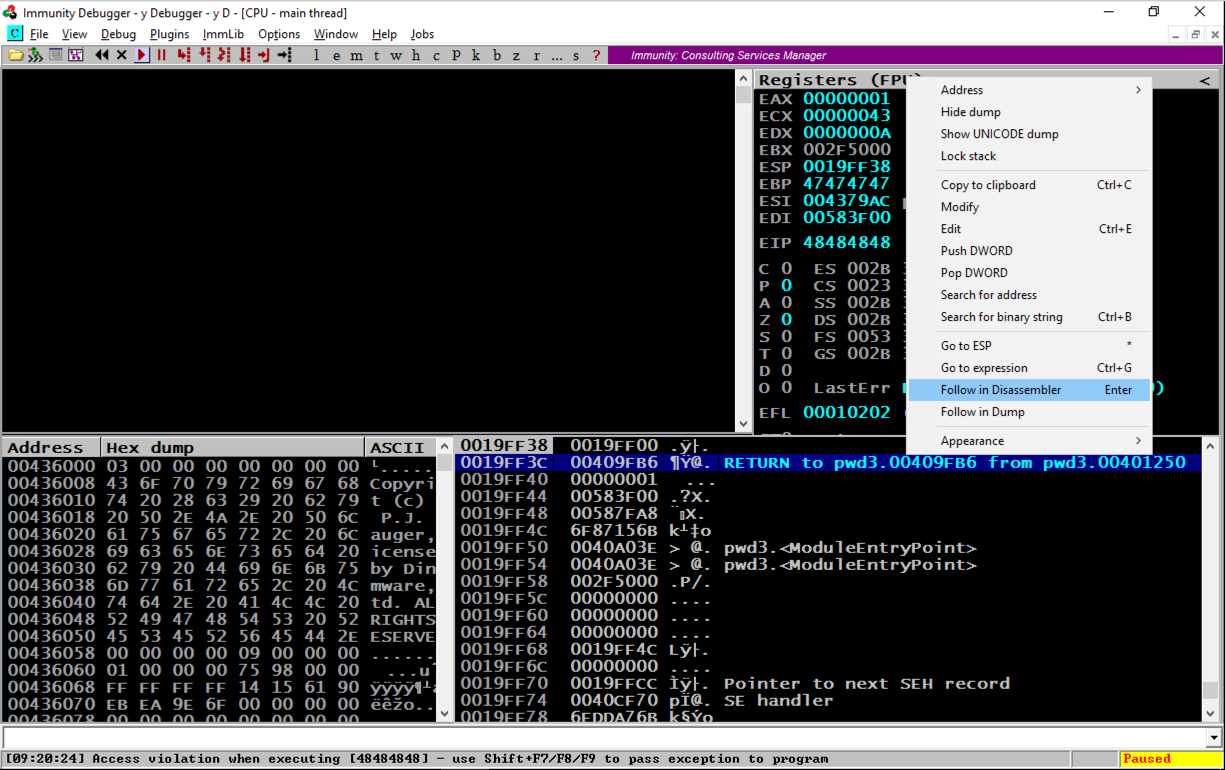 In the top right pane of Immunity, notice that EIP contains 48484848. This is a classic buffer overflow exploit, letting us control the EIP.