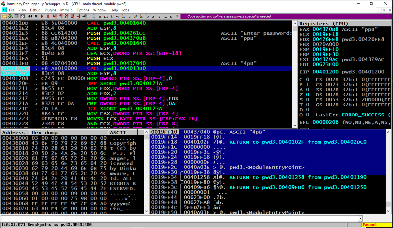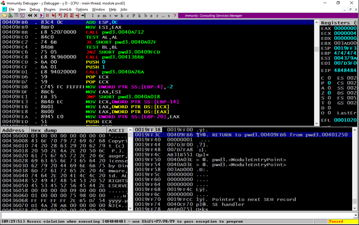 Notice the second word, marked "RETURN to pwd3.00409FB6 from pwd3.00401250". This was the code preceding the crash, so we want to look there.