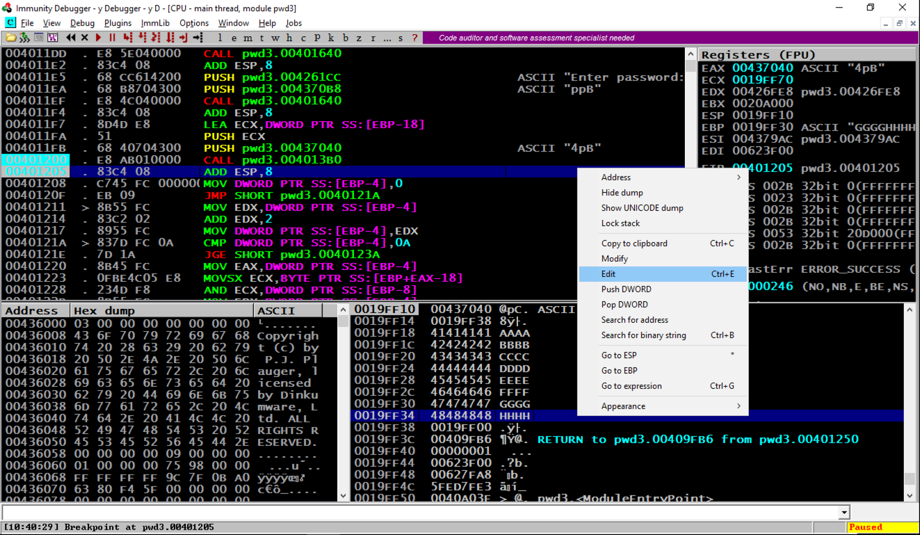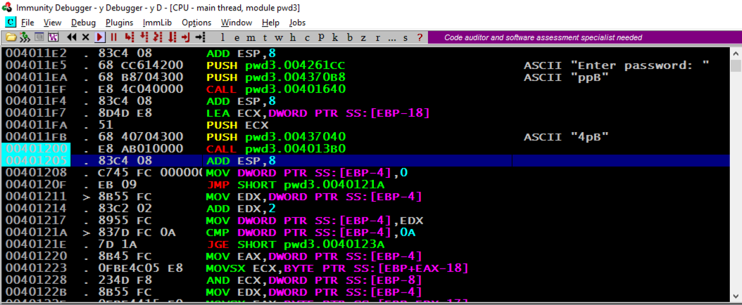 The PUSH instruction at address 4011E5, puts a pointer to the string "Enter password:" onto the stack.