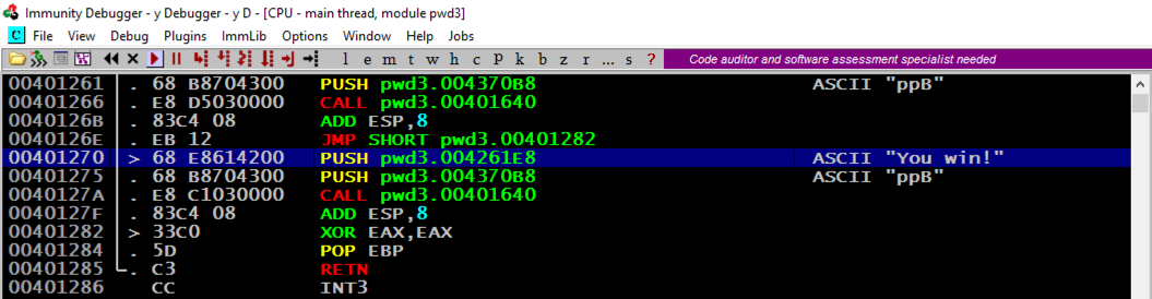 Find the adress of the "You Win!" instruction, which you determined earlier. When I did it, that address was 401270, but your value may be different.