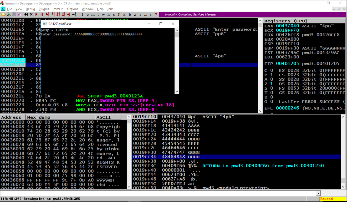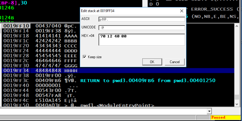 In the stack, the address of the RETURN pointer now contains 48484848, as shown above, which are the ASCII letters "HHHH".