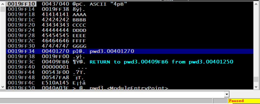 The word after EBP contains a RETURN pointer, at address 19FF34 in the image below.