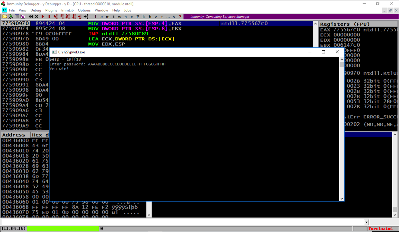 Notice the message at the bottom left of the Immunity window, covered by a green box in the image above. That's the flag.