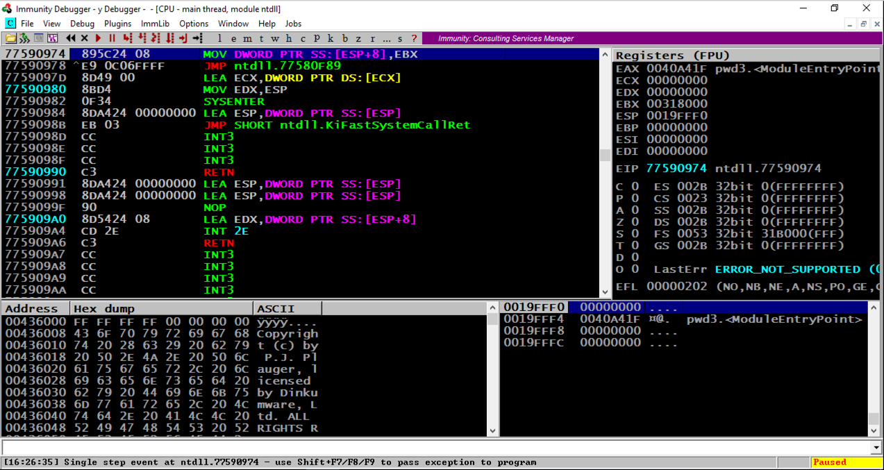 Immunity loads the program. Note that eip, in the top right pane, is in "ntdll", and that the program is "Paused", as indicated in the lower right corner, as shown below.