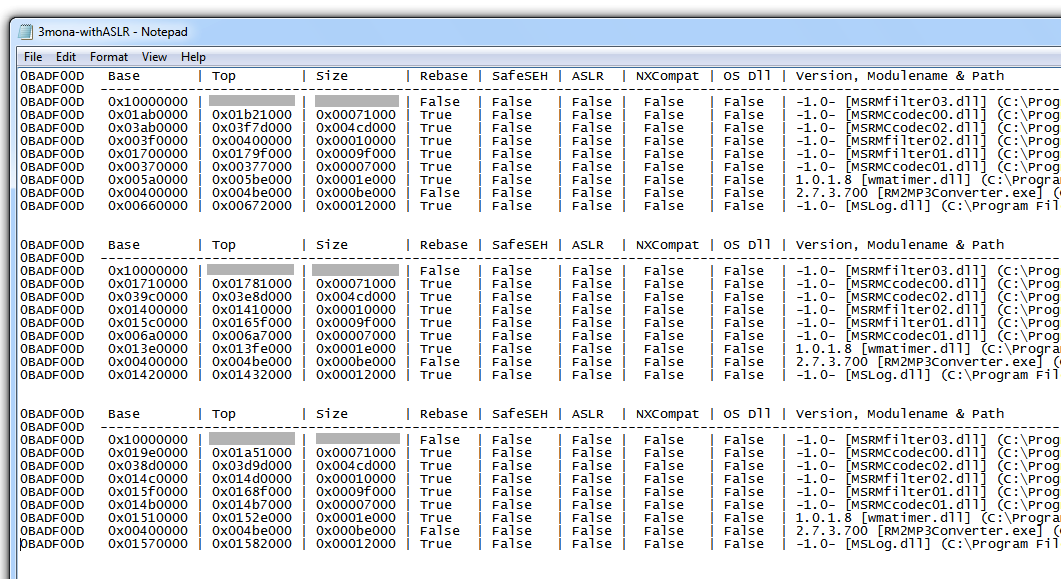 I saved logs from three runs of Immunity, and kept only the modules with ASLR=False.