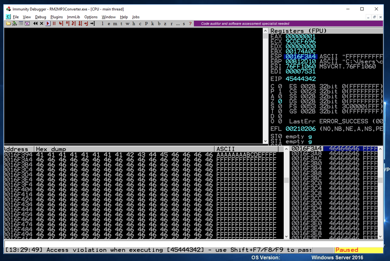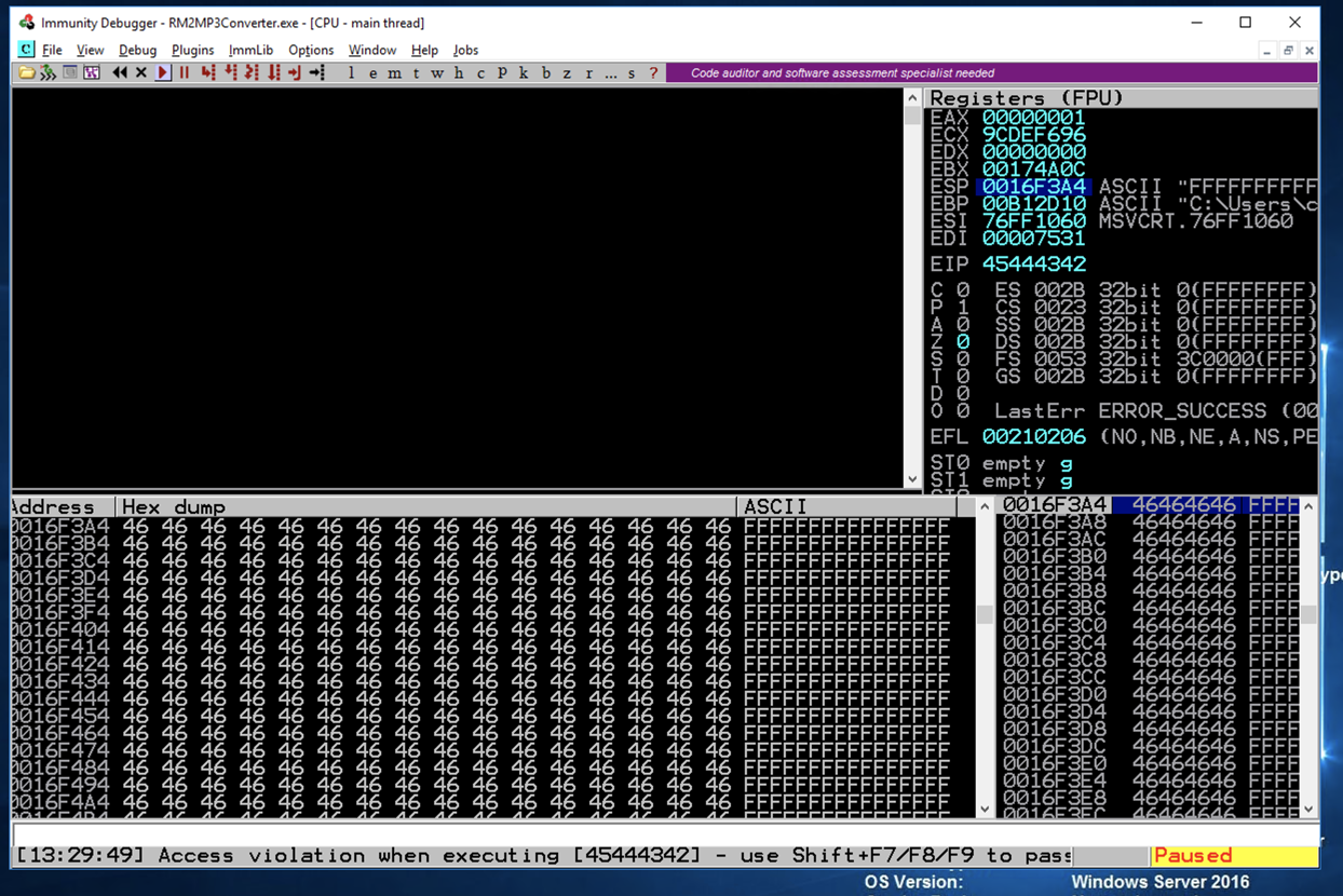 Look in the lower left pane of Immunity. It's full of the 'F' characters we put at the end of the exploit text.