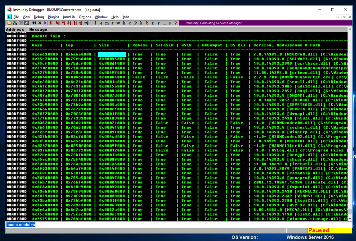 The best thing would be to find one with ASLR=False and Rebase=False, but the only module like that is RM2MP3Converter.exe. However, we can't use that module, because it has a null byte in its address.