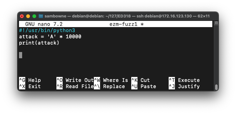 The exploit is output directly into a file named "ezm-attack2" because it's too long to see all at once in a Terminal window.