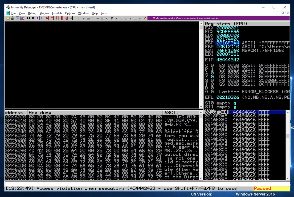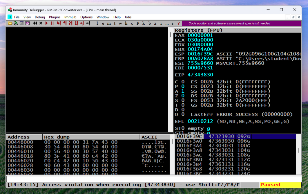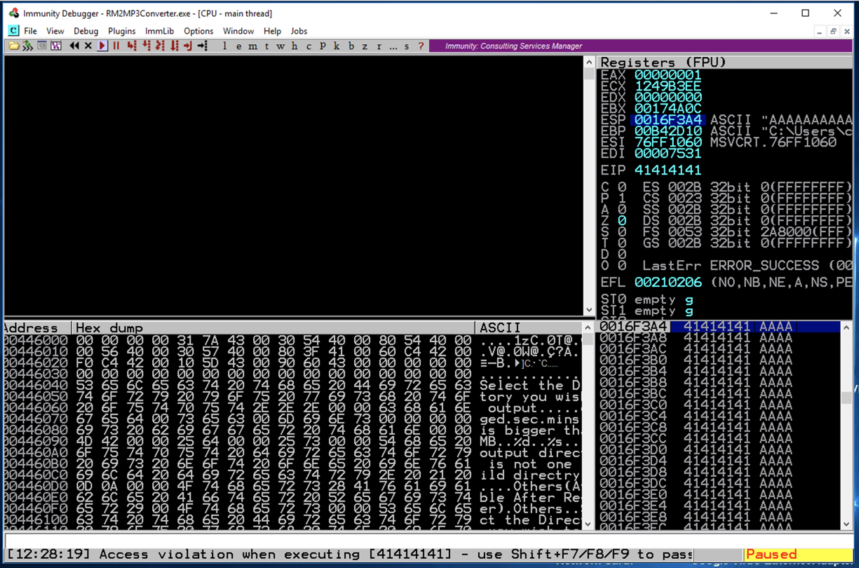 In Immunity, restart "Easy RM to MP3 Converter" and open the hiteip.m3u file.